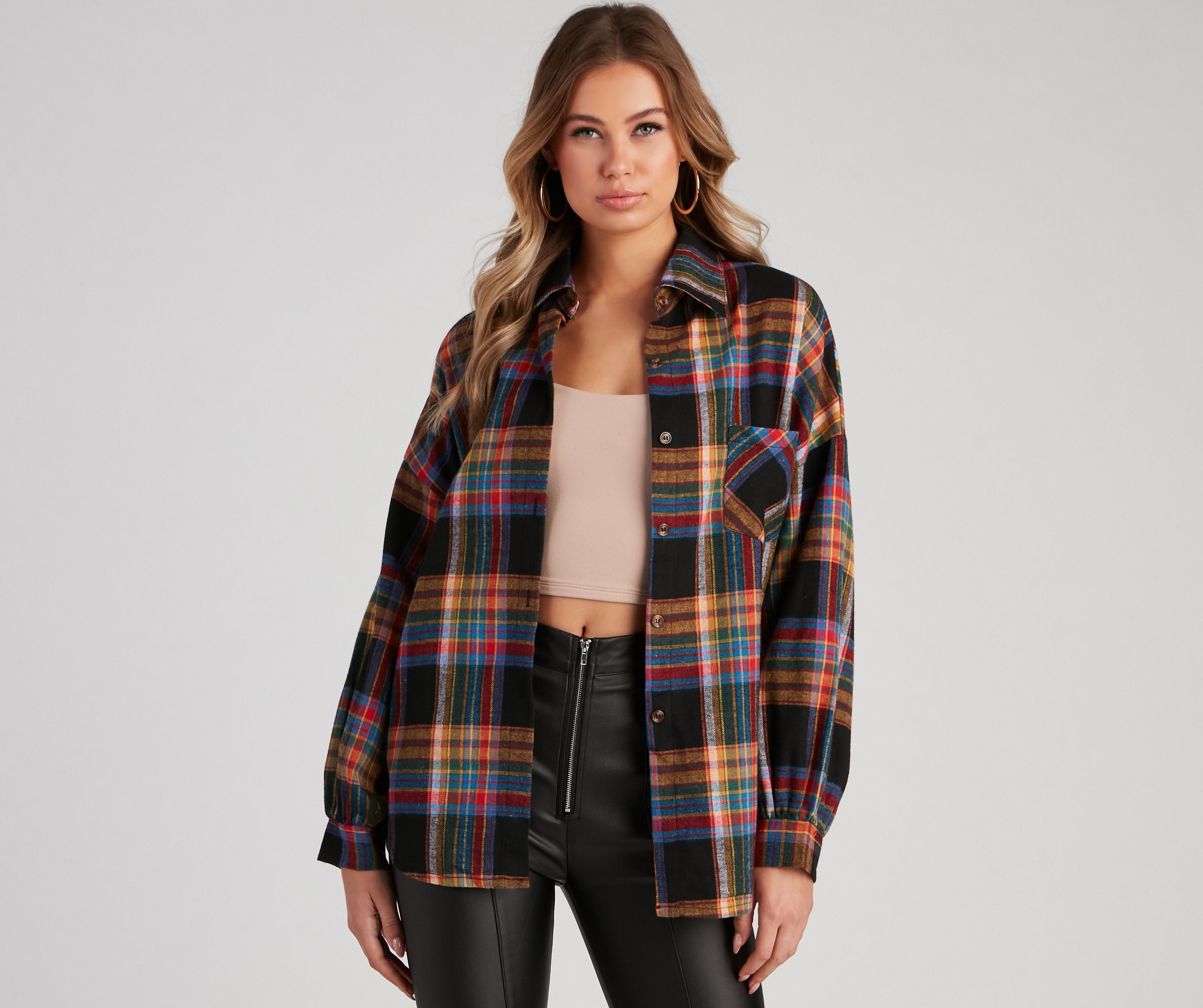 Präsentieren Sie die Jahreszeit, die Sie lieben, mit diesem karierten Hemd! Es hat einen Kragenausschnitt, lange Ärmel mit Manschetten und eine Knopfleiste mit Tasche. Perfekt zu kombinieren mit Kunstlederleggings.