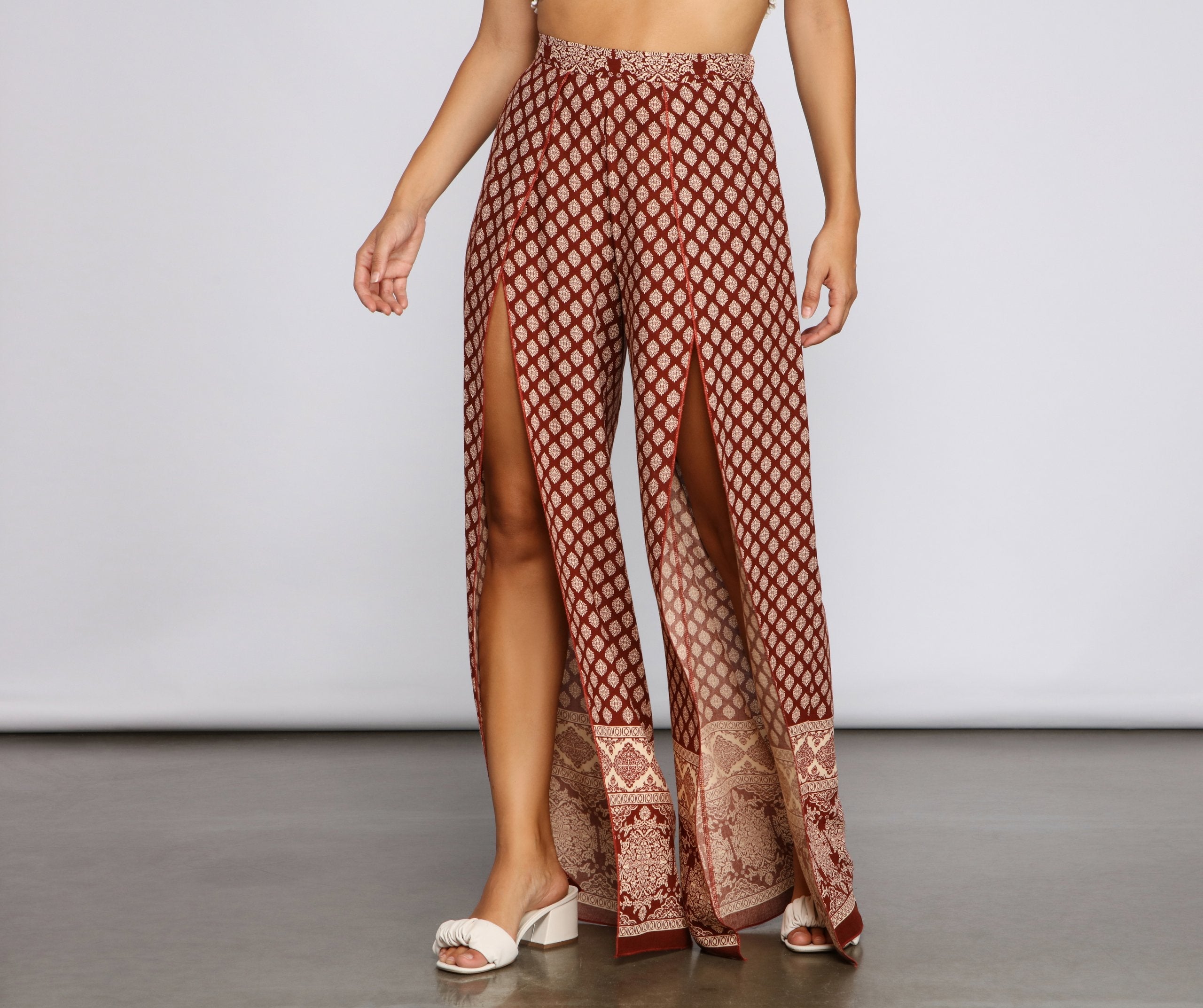 Zeige deine freigeistige Seite mit einer Boho-Hose – perfekt für die Festivalsaison! Die Hose hat einen hohen Bund, einen Boho-Print und hohe Schlitze, die vom Oberschenkel bis zum Saum reichen. Sie besteht aus Gaze-Strick. Vervollständige den Look mit einem Häkeltop und Sandalen.