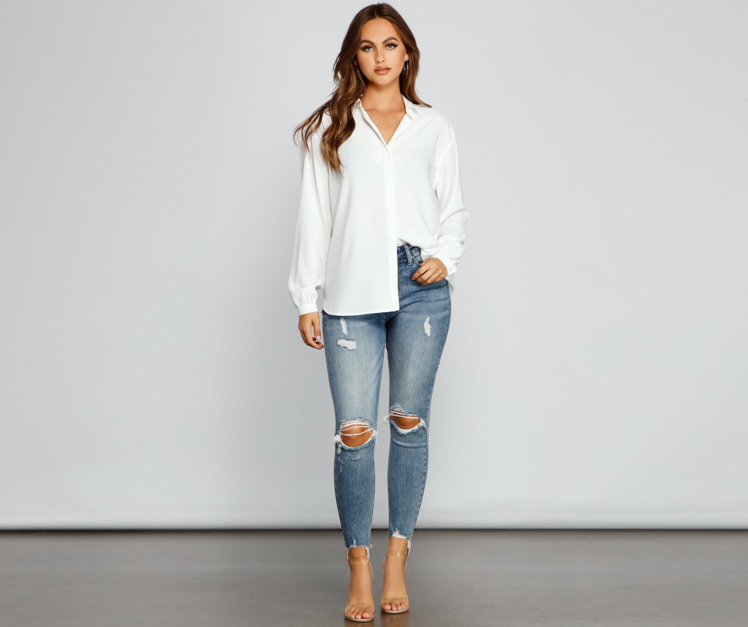 Hinterlassen Sie mit dieser langärmeligen Bluse einen bleibenden Eindruck! Sie ist mit Knopfleiste, Kragen und mittellanger Länge gestaltet. Das Hemd besteht aus leichtem Webstoff mit entspannter Passform und minimalem Stretch. Tragen Sie es zu einem Bleistiftrock und Sie werden begeistert sein.