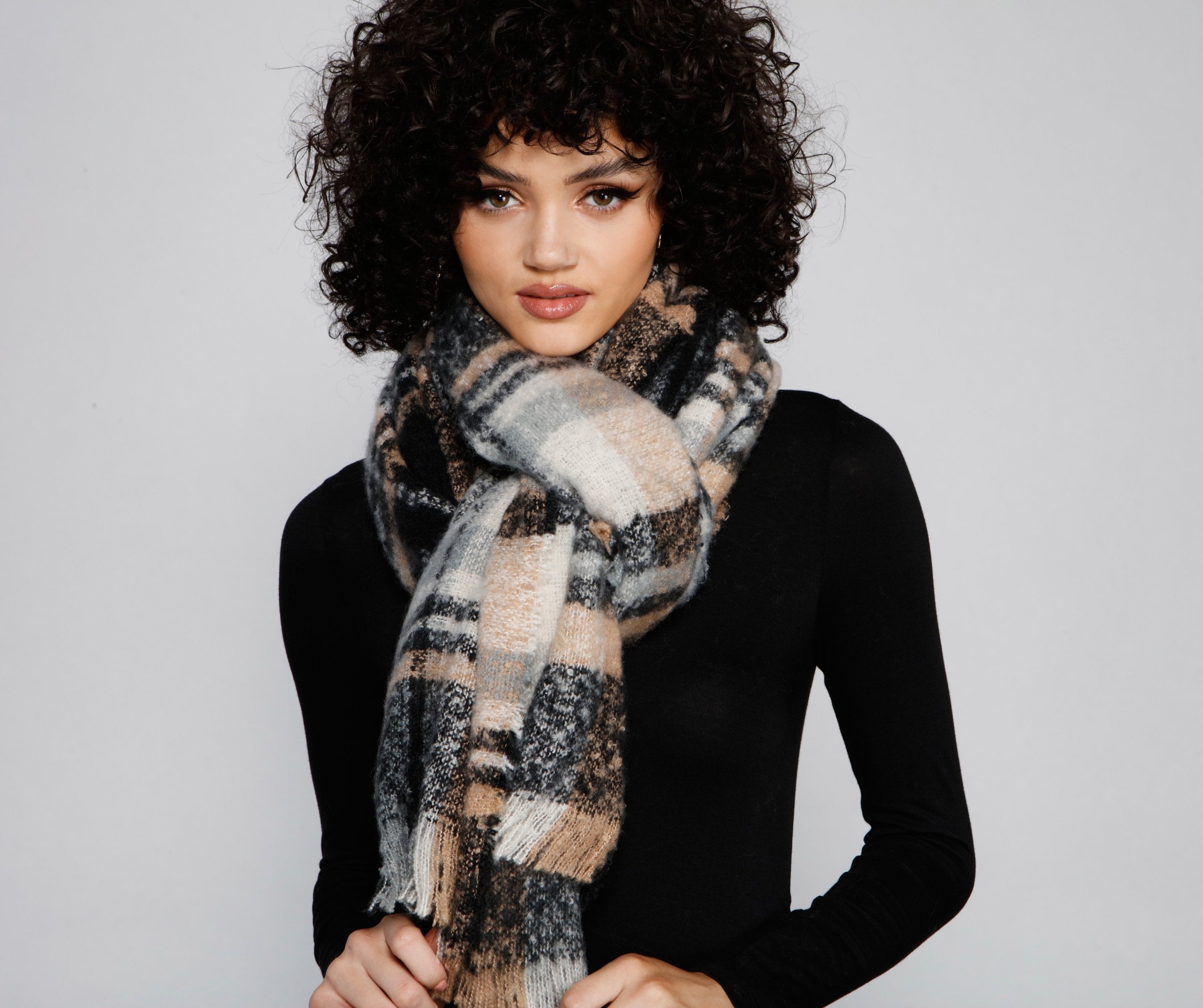 Hüllen Sie sich in diesen karierten Schal und genießen Sie es gemütlich. Er besticht durch ausgefranste Kanten, weiches Material und ein übergroßes Design. Vervollständigen Sie den Look mit einem süßen Pulloverkleid.