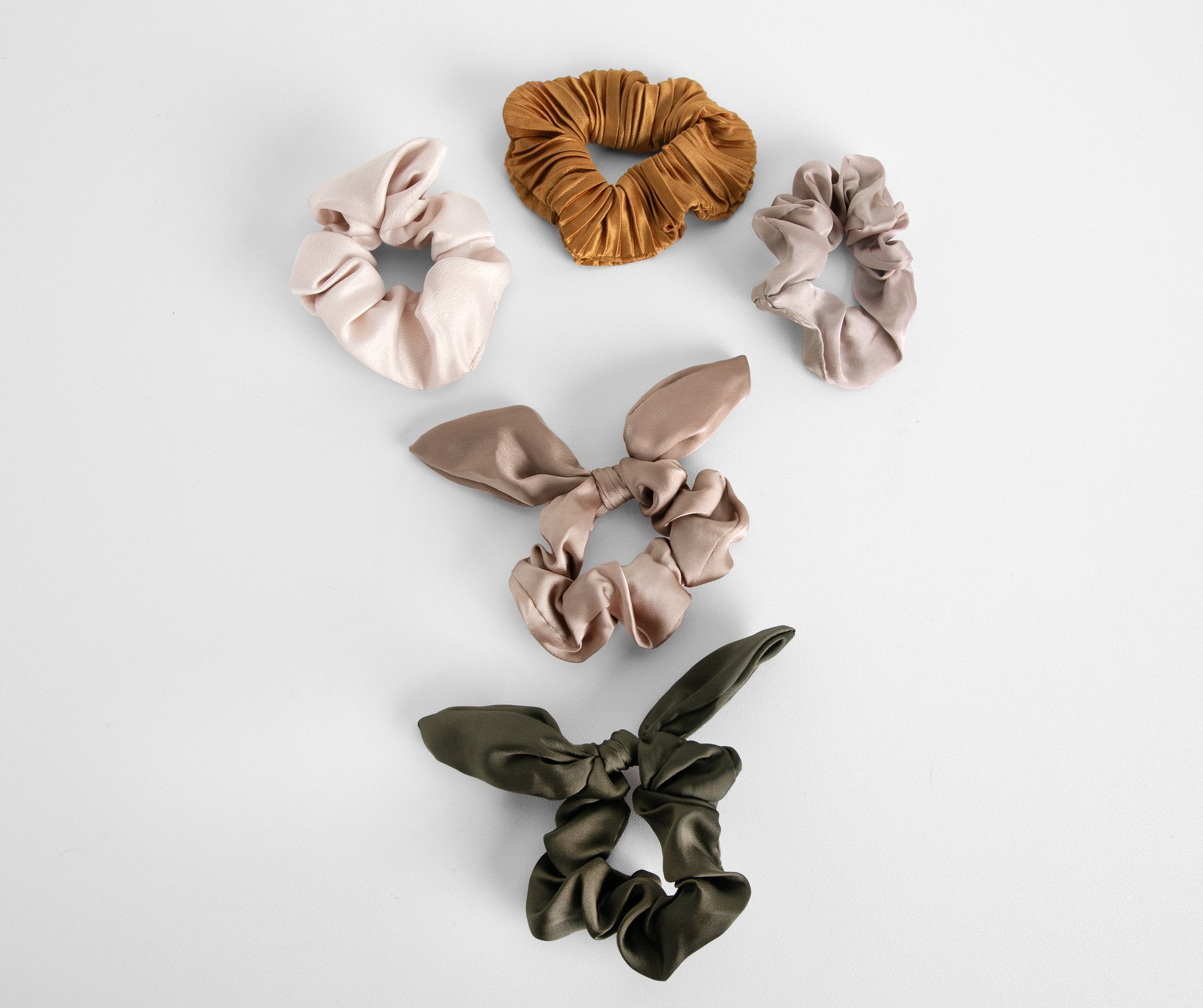 Verschönern Sie Ihre Herbst-Accessoires mit diesem süßen Set aus fünf Satin-Haargummis in den schönsten Farben für kühles Wetter! Zwei Haargummis haben ein geknotetes Krawattendetail und ein Haargummi hat Falten im Akkordeon-Stil.