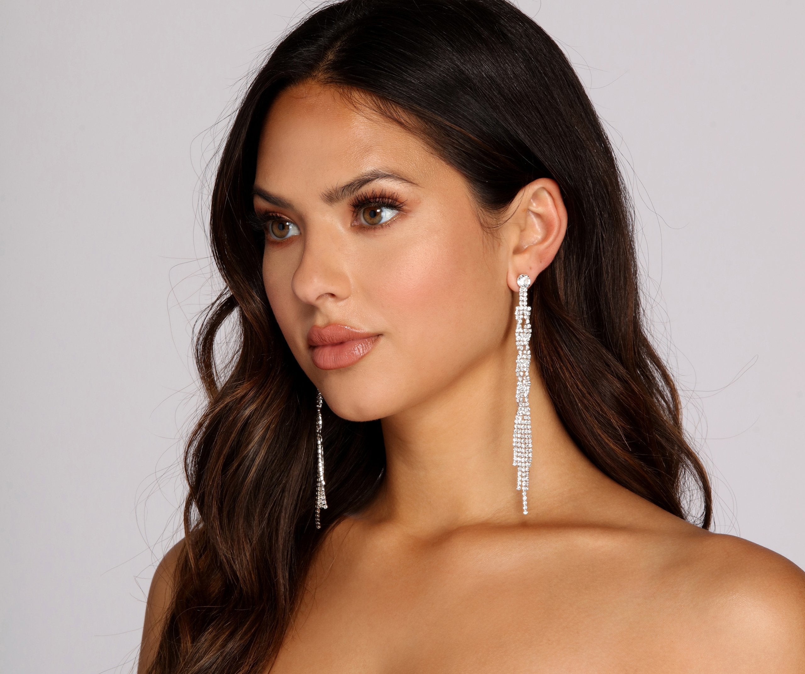 Schimmern, glänzen, funkeln und erfreuen Sie sich an diesen schulterlangen Strass-Ohrringen! Veredeln Sie Ihre Abendgarderobe mühelos. Der Duster-Stil zeichnet sich durch einen langen Tropfen-Kronleuchter-Dreh mit Steckverschluss aus.