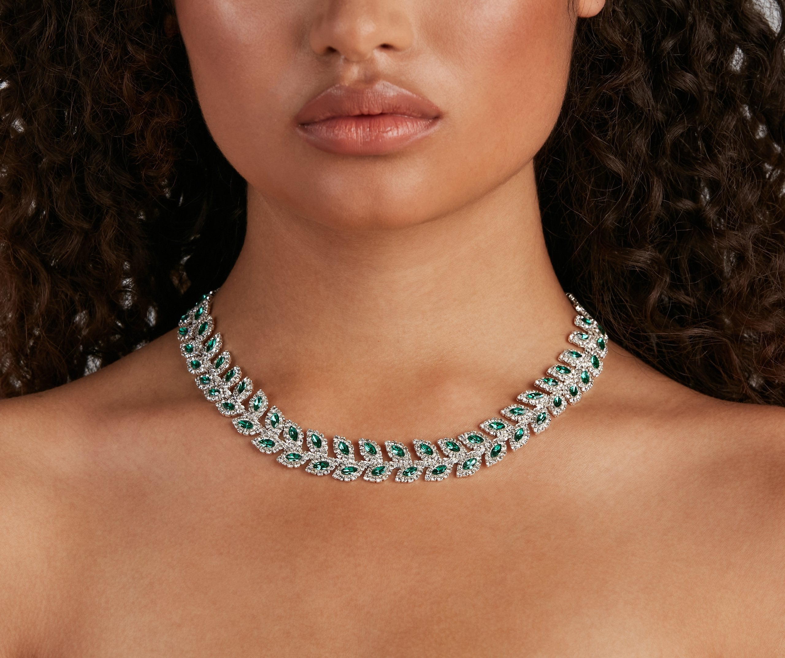 Setzen Sie mit diesem Kragen mit Strassblättern und schicken Absätzen das perfekte Statement.