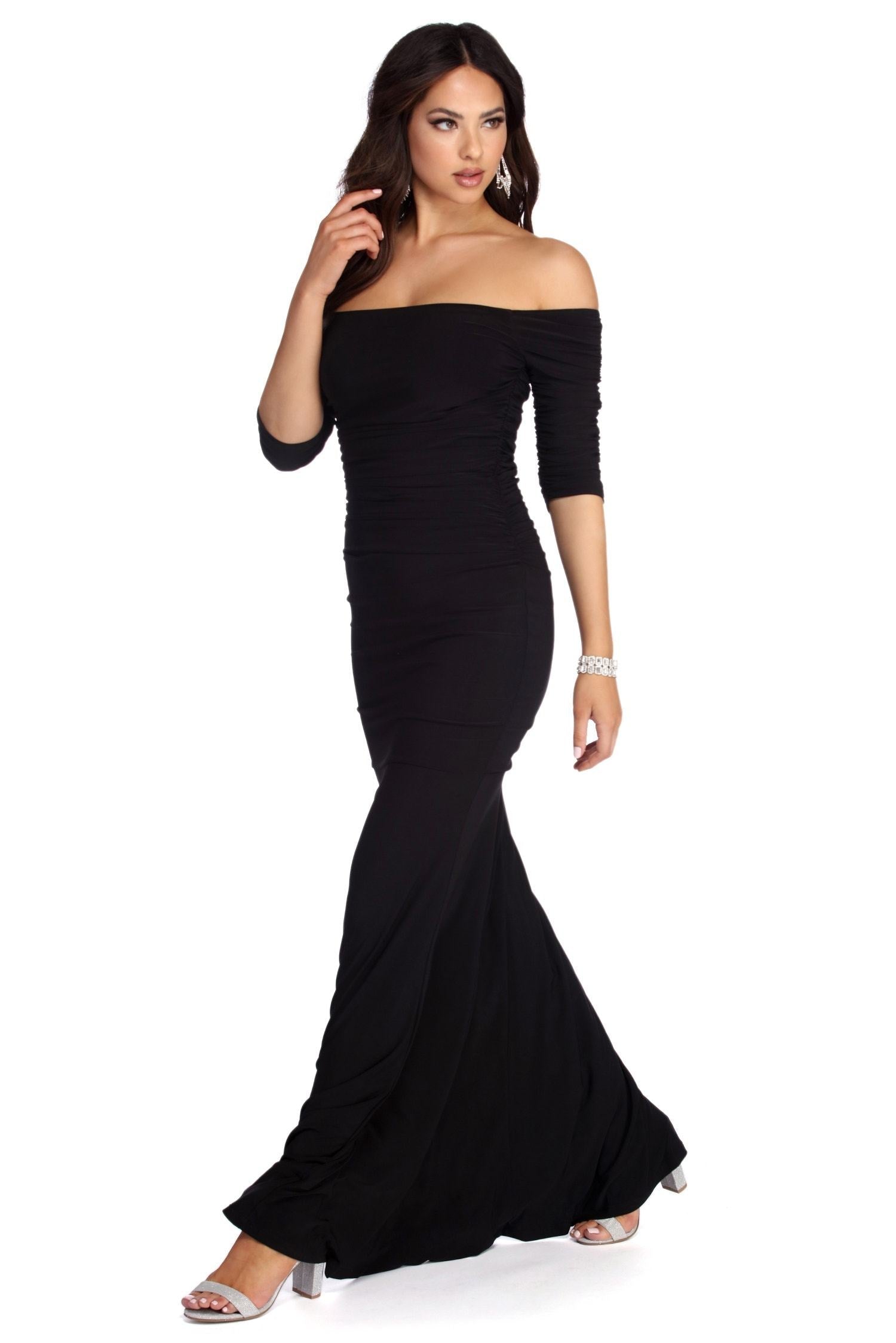 Machen Sie mit unserem Stella-Kleid einen atemberaubenden Eindruck! Das Kleid ist komplett schwarz und hat einen schulterfreien Ausschnitt. Die gerüschten langen Ärmel und die seitlichen Rüschen erzeugen einen kaskadenartigen Effekt, der eine bodenlange Silhouette ergibt. Das Kleid besteht aus einem schwarz gefütterten, glatten Strickstoff, der eine figurbetonte Passform mit moderater Dehnbarkeit bietet. Mit Reißverschluss hinten.