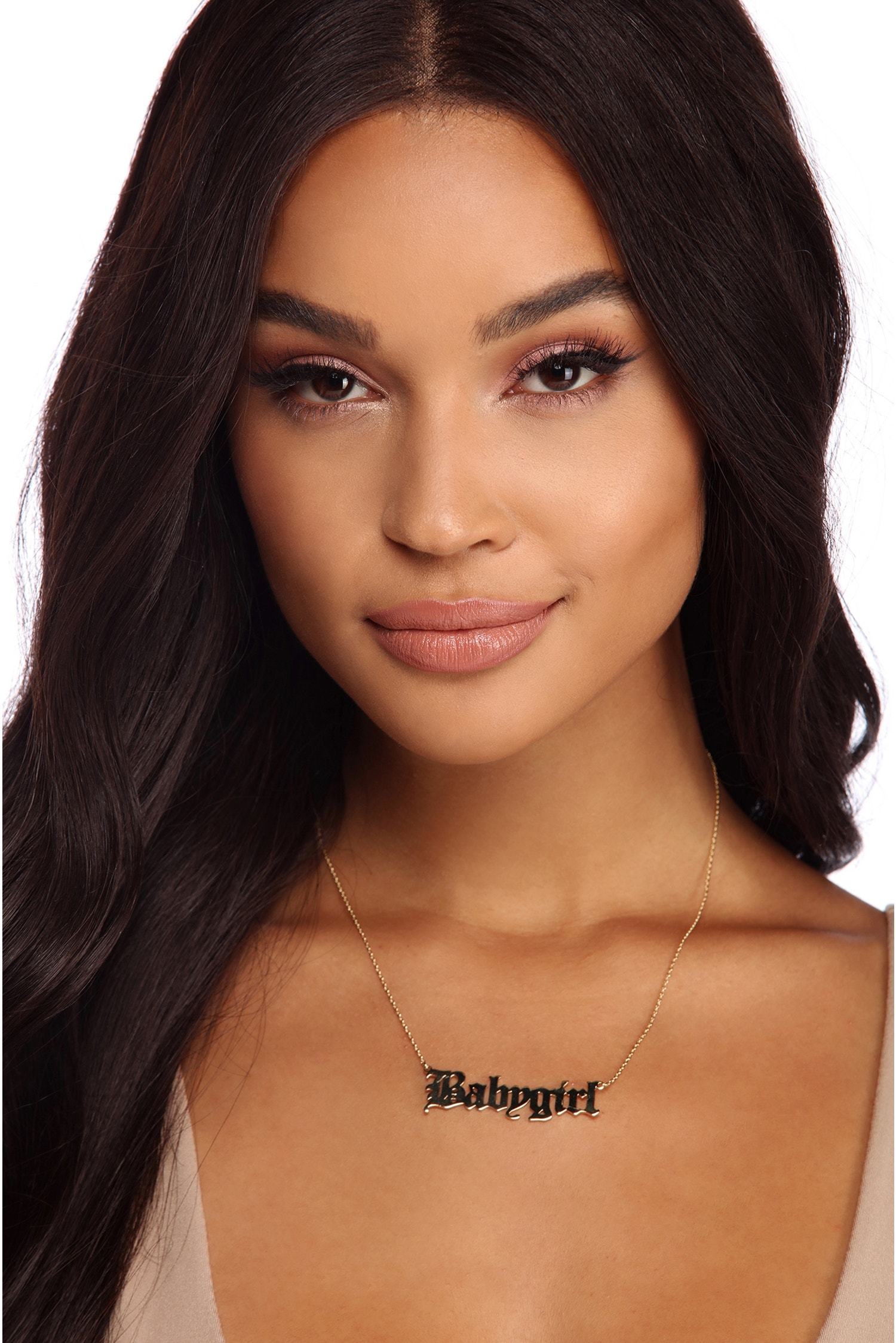 ¡Deja que este collar hable por ti! Cuenta con una delicada cadena de oro y está adornado con una gran inscripción que dice "Babygirl" en negrita con letra inglesa antigua. Incluye cierre de mosquetón.