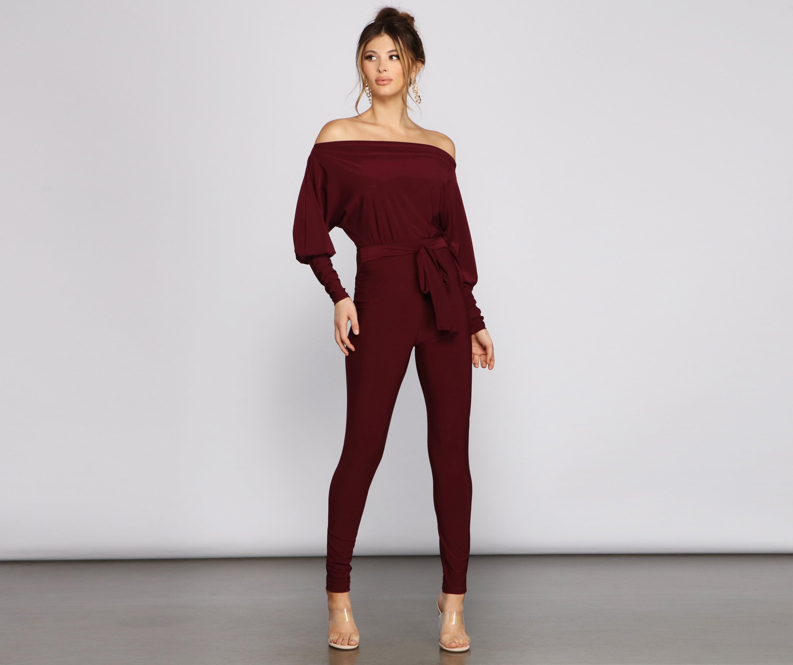 Luce un estilo clásico y chic con un mono precioso. Este mono presenta un escote barco con hombros descubiertos, mangas largas, un cinturón ajustable y un corte ajustado en la pierna. Está confeccionado en un tejido de punto suave que se adapta al cuerpo con una elasticidad moderada. Completa el look con unos mules .