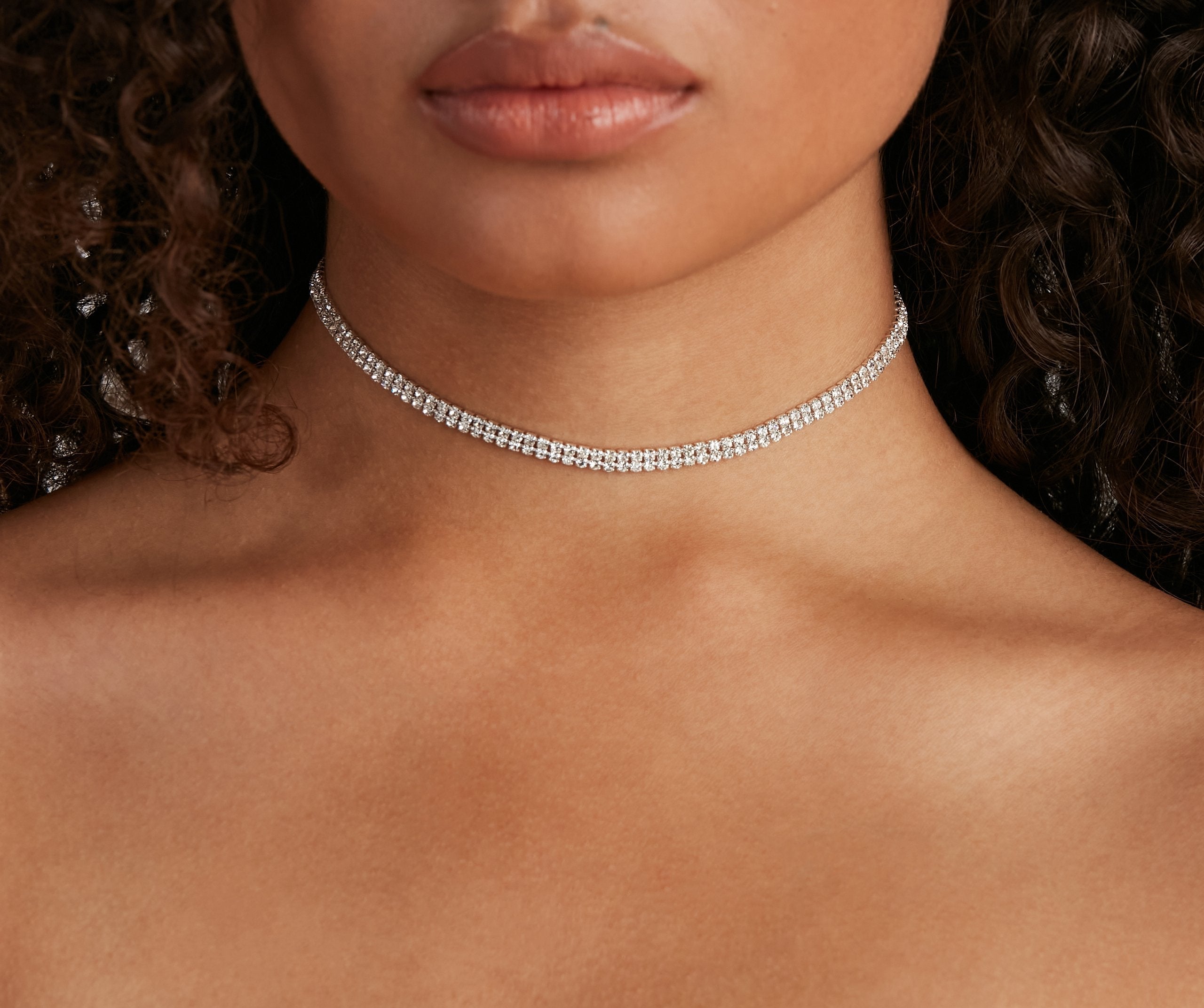 Dale un toque de brillo a tu vestido formal con esta delicada gargantilla de dos hileras de diamantes de imitación y cierre de mosquetón. Completa el look con unos pendientes glamurosos.