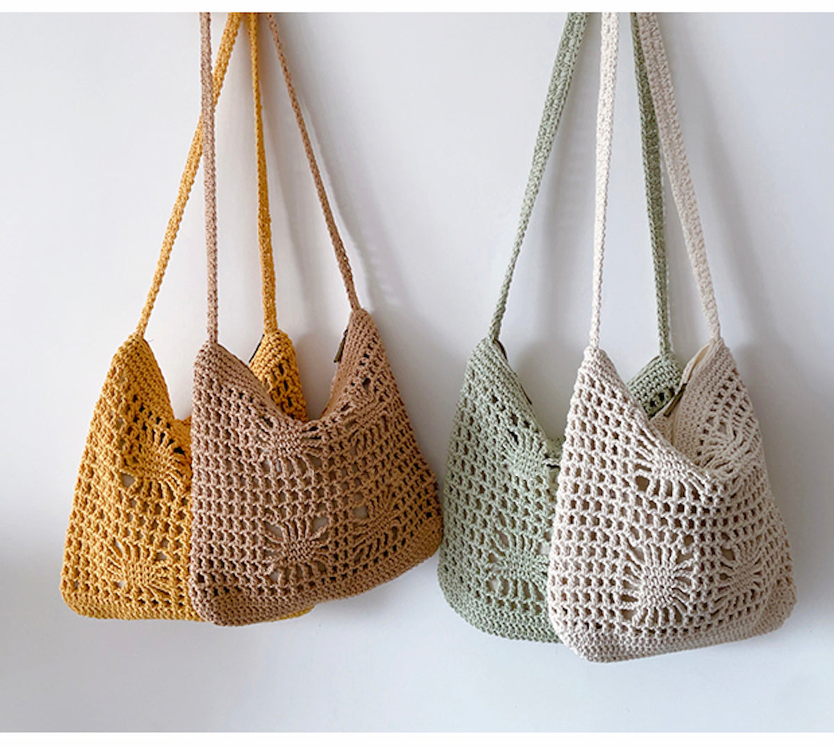 Retro Artsy Cotton Knitted Shoulder Bag. Handmade Crochet Crossbody Bag. Fashion Casual Bag. Gift for Her. Women's Woven Drawstring Bag