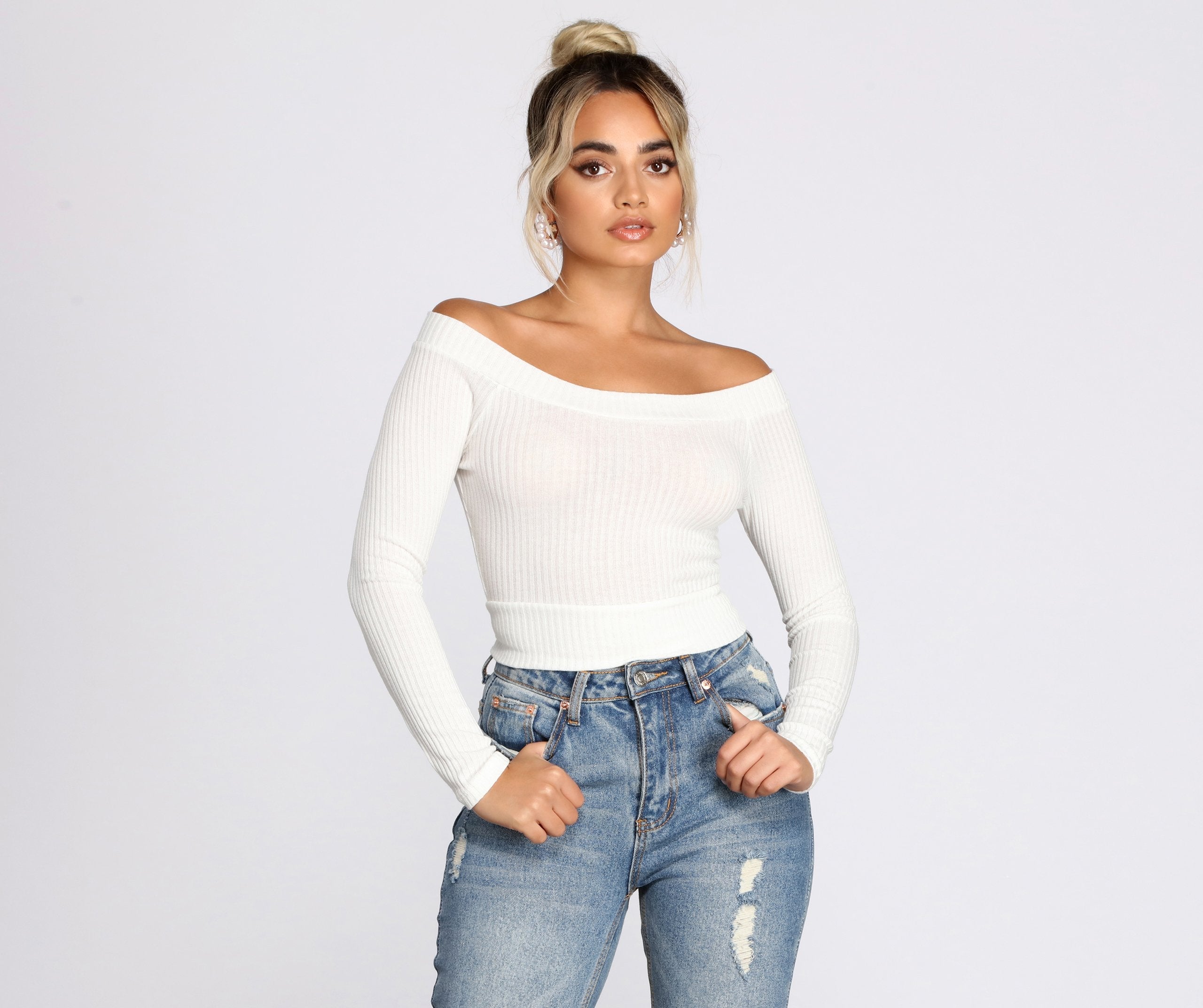 Sencillo pero elegante, este top corto con hombros descubiertos es un básico necesario para muchos looks lindos.