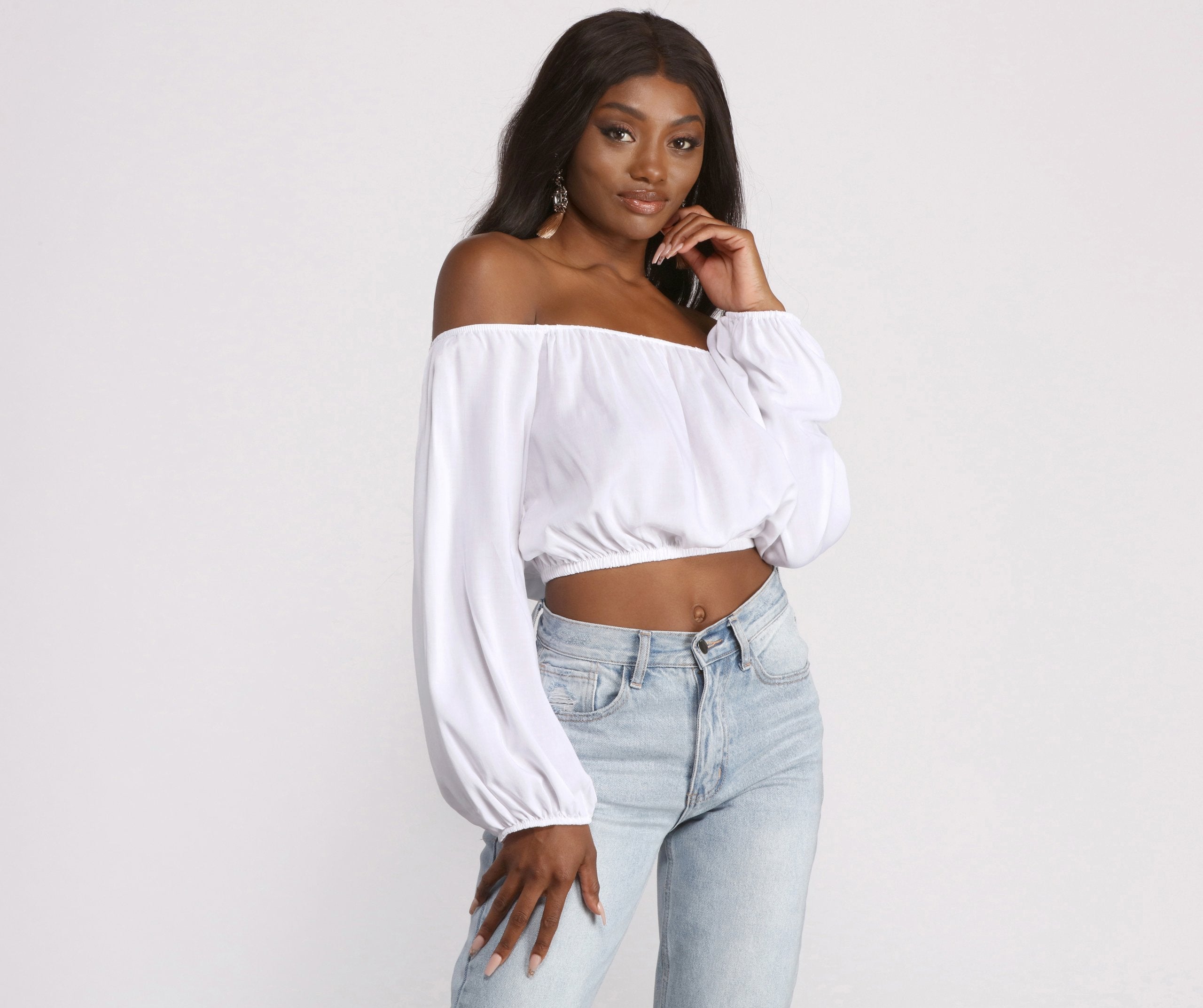 Opta por lo básico con un top corto. Este top, ideal para festivales, presenta un escote elástico con hombros descubiertos, mangas largas con puños elásticos y bajo corto. Está confeccionado en un tejido ligero que ofrece un ajuste relajado y una ligera elasticidad. Completa tu look con unos vaqueros de cintura alta y unas cuñas .