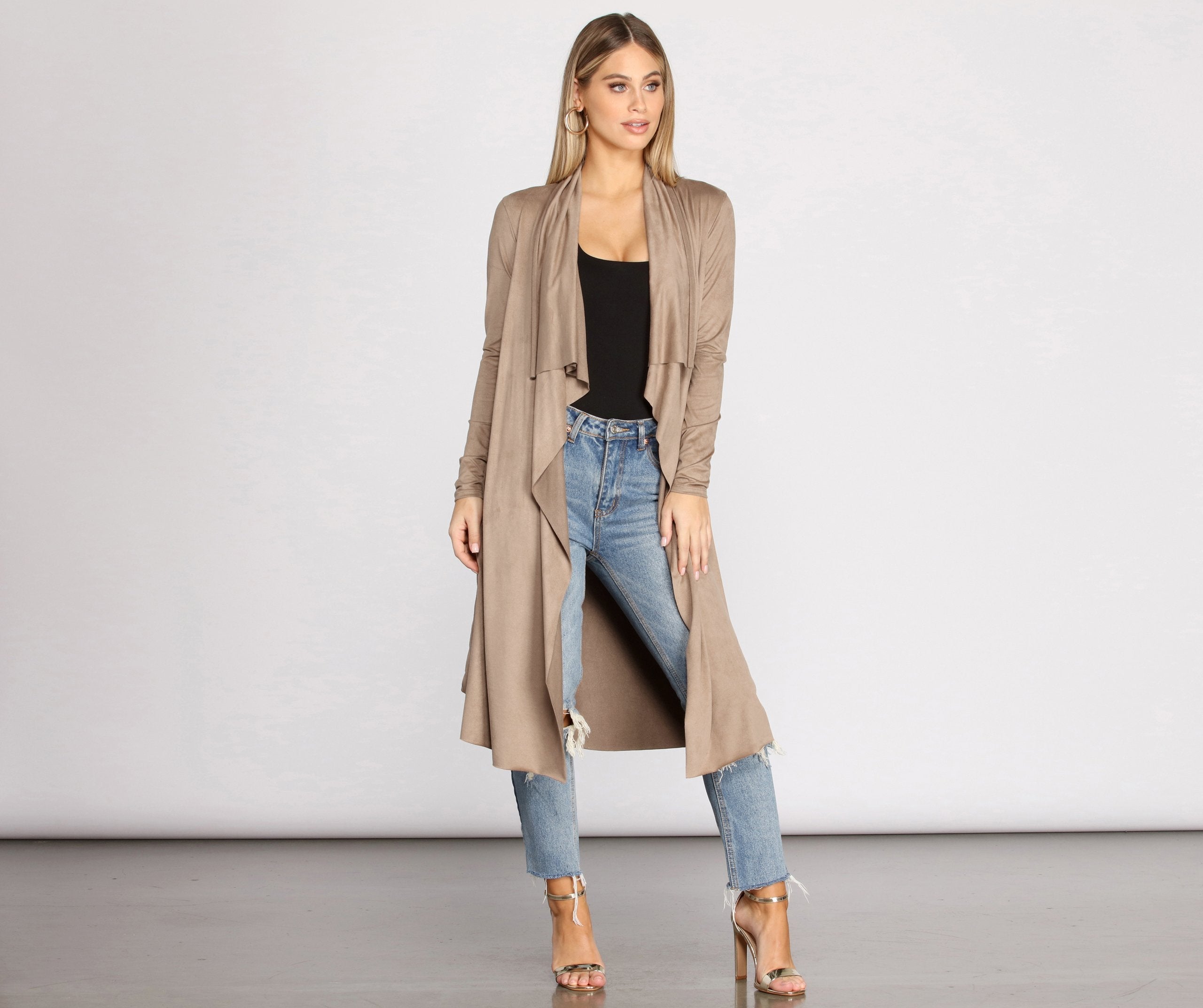 ¿Necesitas un poco de capas para darle un toque especial? ¡Dale un toque de distinción a tu conjunto con esta elegante gabardina de ante sintético! Versátil y elegante, cuenta con cuello drapeado, mangas largas, frente abierto, trabillas y una corbata extraíble. La chaqueta está confeccionada en un tejido suave similar al ante con elasticidad moderada. Combínala con un body básico y unos mom jeans a la moda.