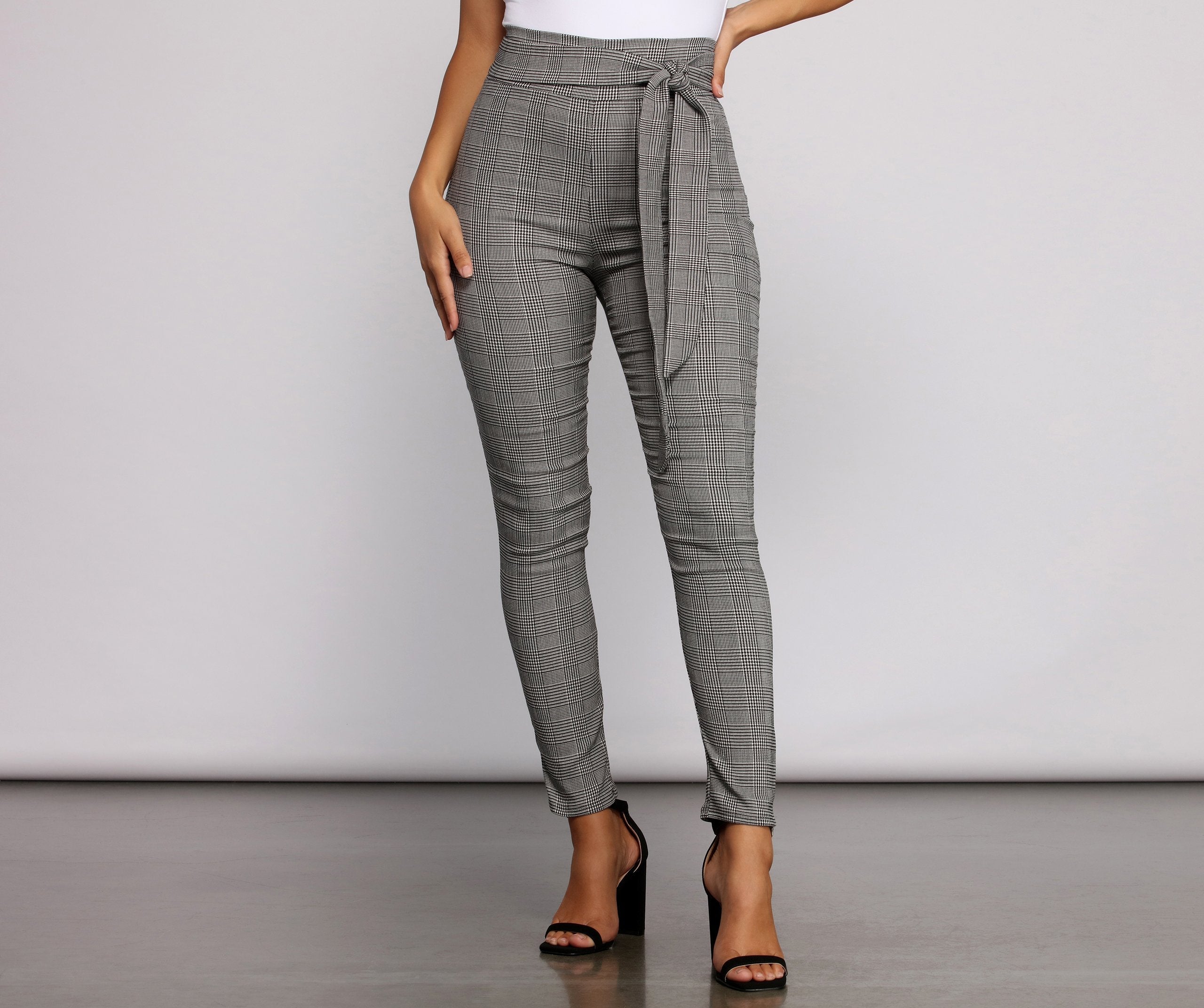 Luce elegante y elegante con estos elegantes pantalones ajustados a cuadros con lazo en la cintura. Tienen tiro alto, detalle de lazo al frente y un favorecedor corte ajustado. Úsalos para la oficina y podrás combinarlos fácilmente para la hora feliz después. Combínalos con una blusa bonita y tacones de bloque clásicos .