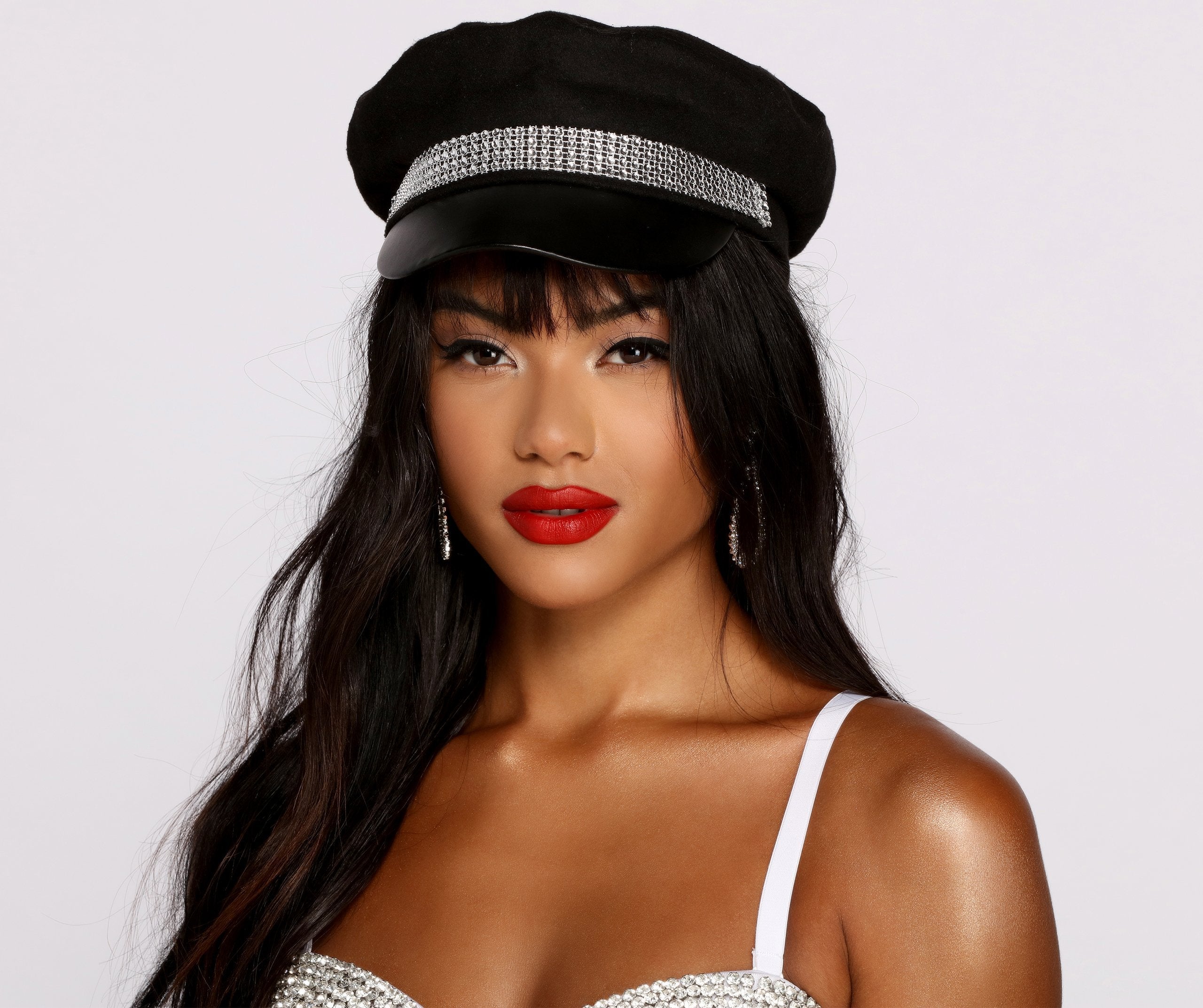 Dale un toque de glamour a tu look con este sombrero de taxista con pedrería. Tiene un ribete de pedrería y una ala de piel sintética. Completa tu look con este accesorio de moda y combínalo con pendientes brillantes para una noche divertida.