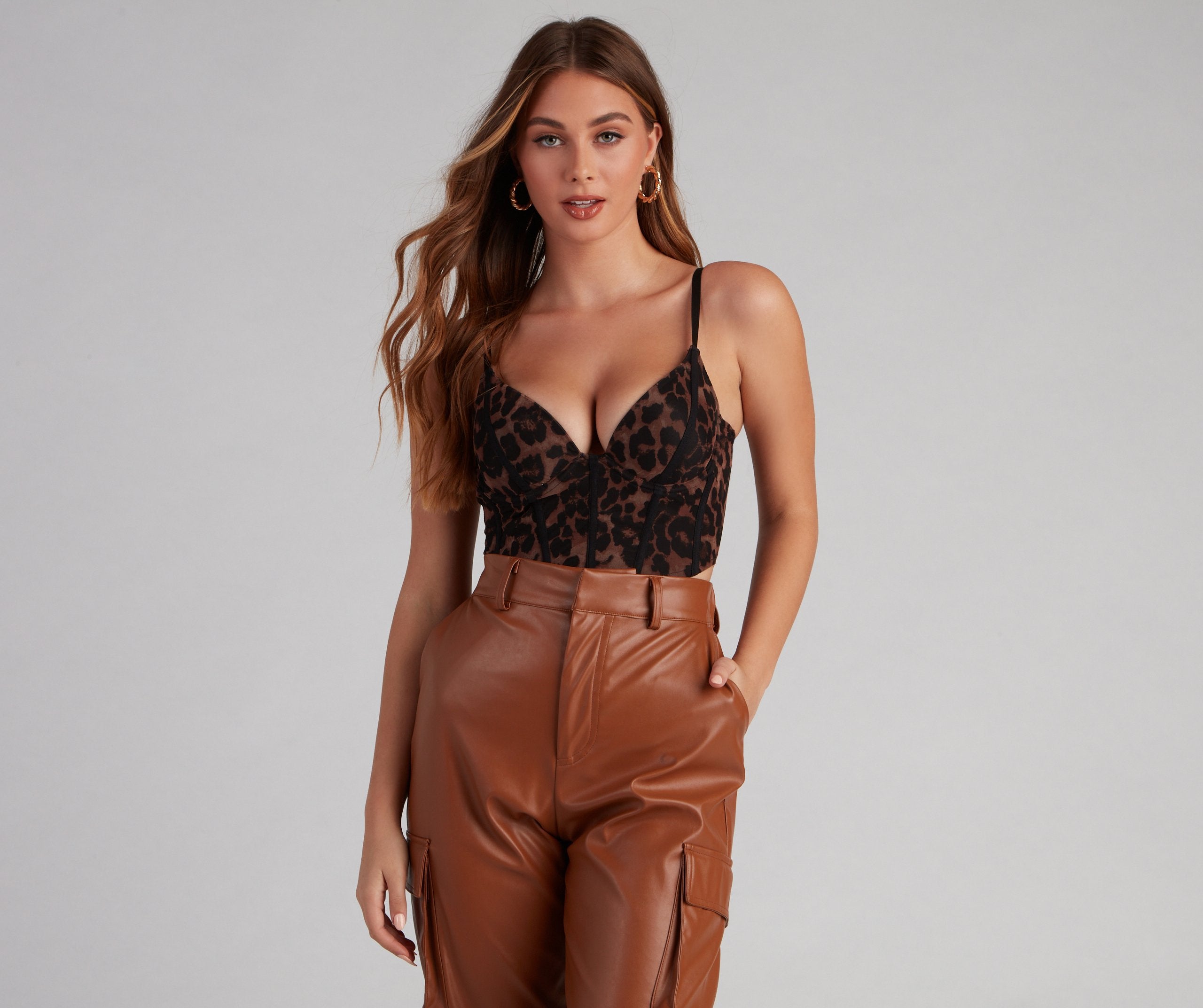 Domina la escena con este bustier de malla de leopardo, ¡diseñado para dejar boquiabierta a cualquiera! Cuenta con tirantes ajustables, escote pronunciado con relleno y aros para mayor sujeción. Las varillas flexibles realzan tus curvas y estilizan el corpiño ajustado con cierre de cremallera con corchetes. Completa tu look atrevido con unos pantalones paper bag.