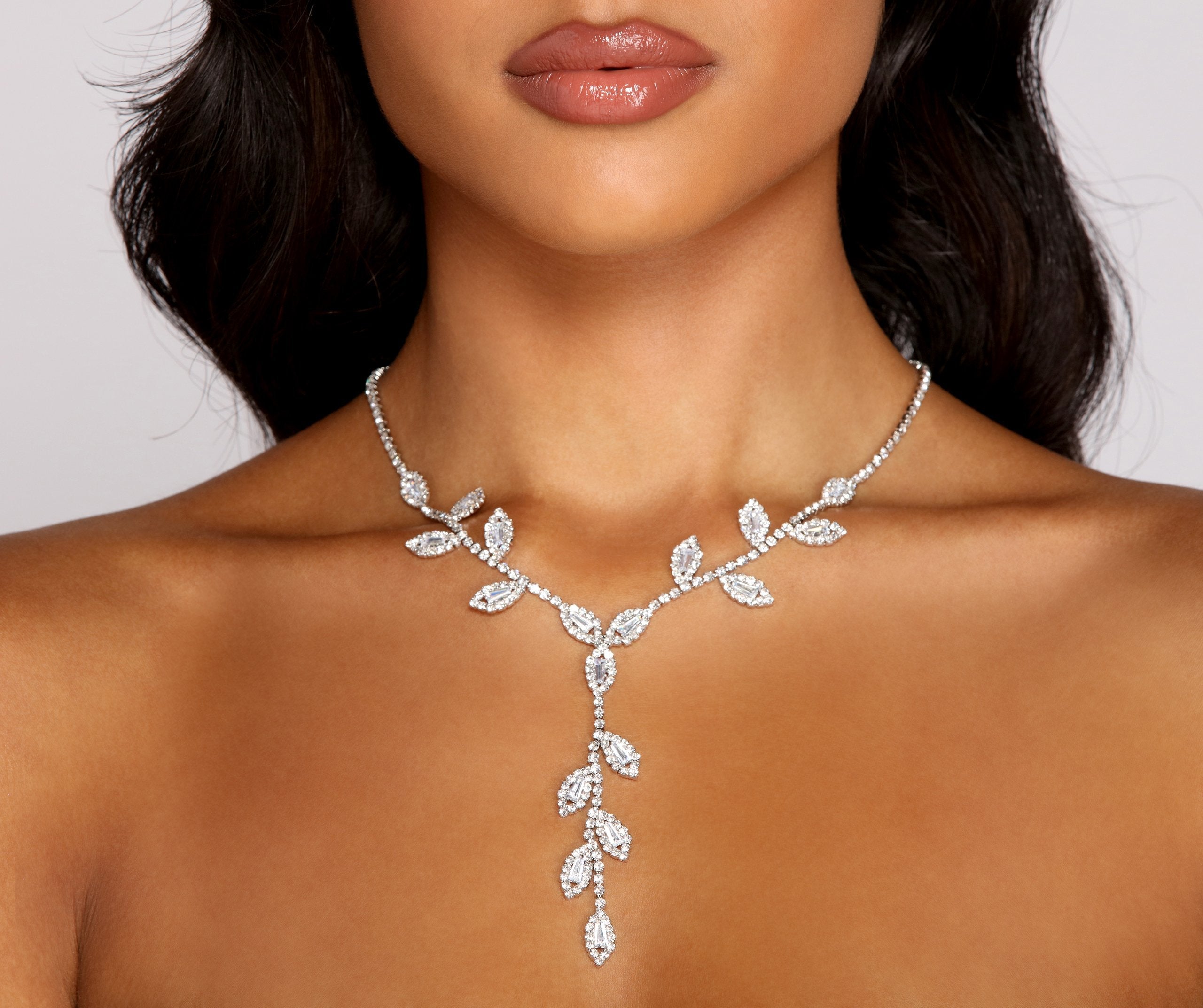 Brilla con un lujoso collar de diamantes de imitación que realza tu estilo glamuroso. El collar tiene forma de V, adornos de diamantes de imitación en forma de hoja y cierre de mosquetón. Completa tu look con un vestido de satén .