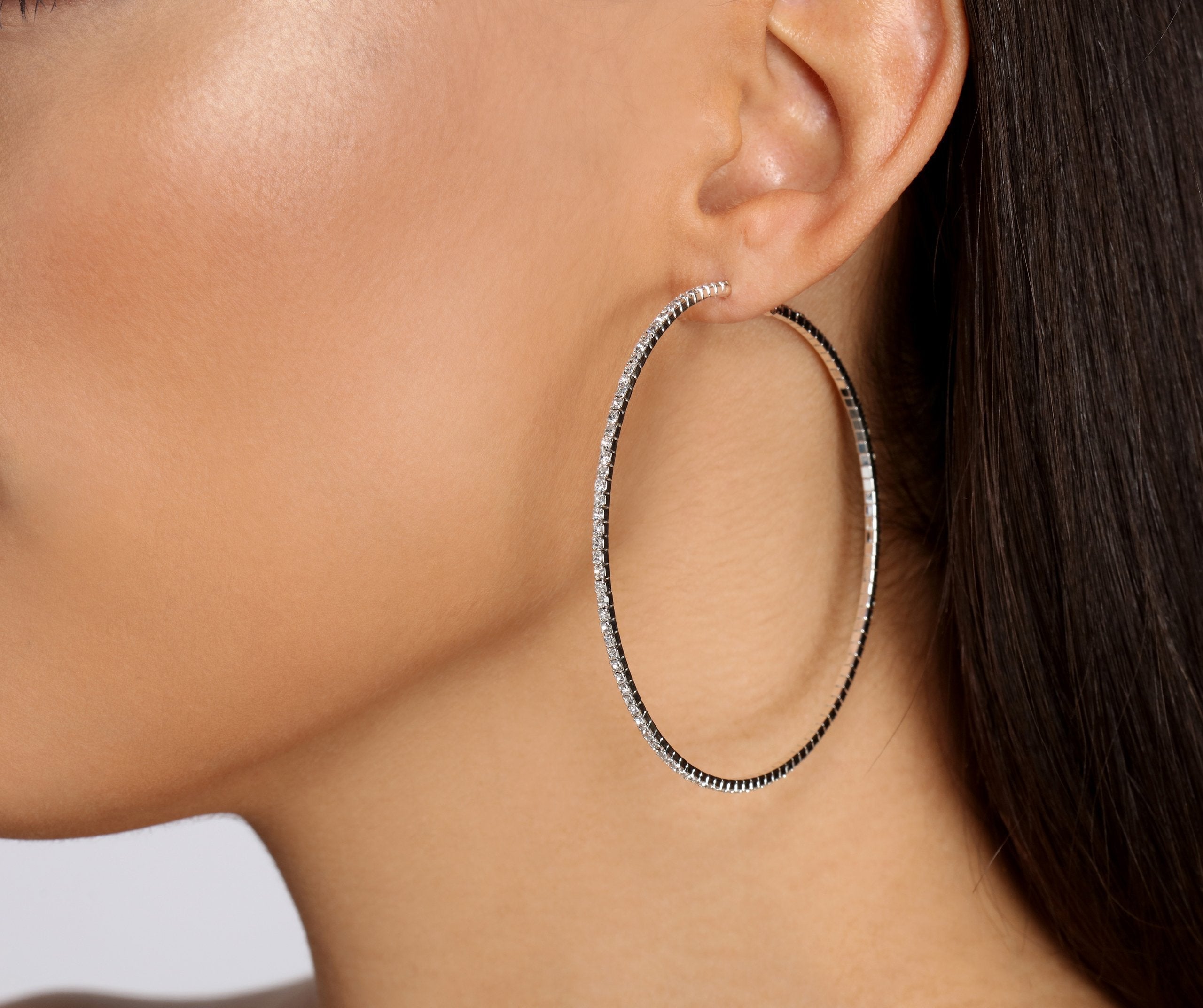 Add these dainty hoops as that little something to finish off your look. that takes your look to the next level!These hoop earrings feature beautiful crystal-like details to top off all your looks with dazzling detail. Earrings feature a post back closure for a secure comfortable fit. Style this sleek hoops with achic bodysuitandhigh waist jeansfor a stunning look.