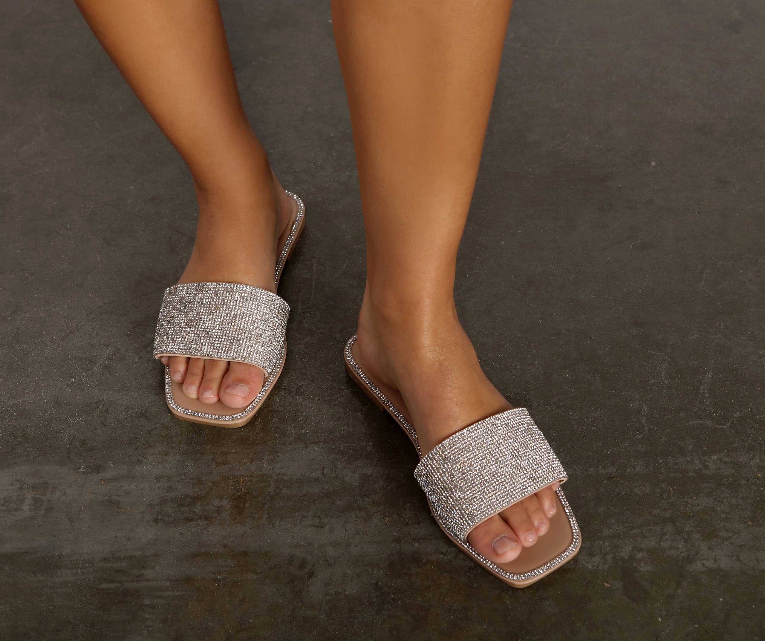 Slip-on these glam sandals that bring the luxe to your look! The sandals feature a trendy slip-on design. a square toe. and a wide toe strap embellished with sparkling rhinestones. Complete look with a stunning swimsuit and sunglasses.
