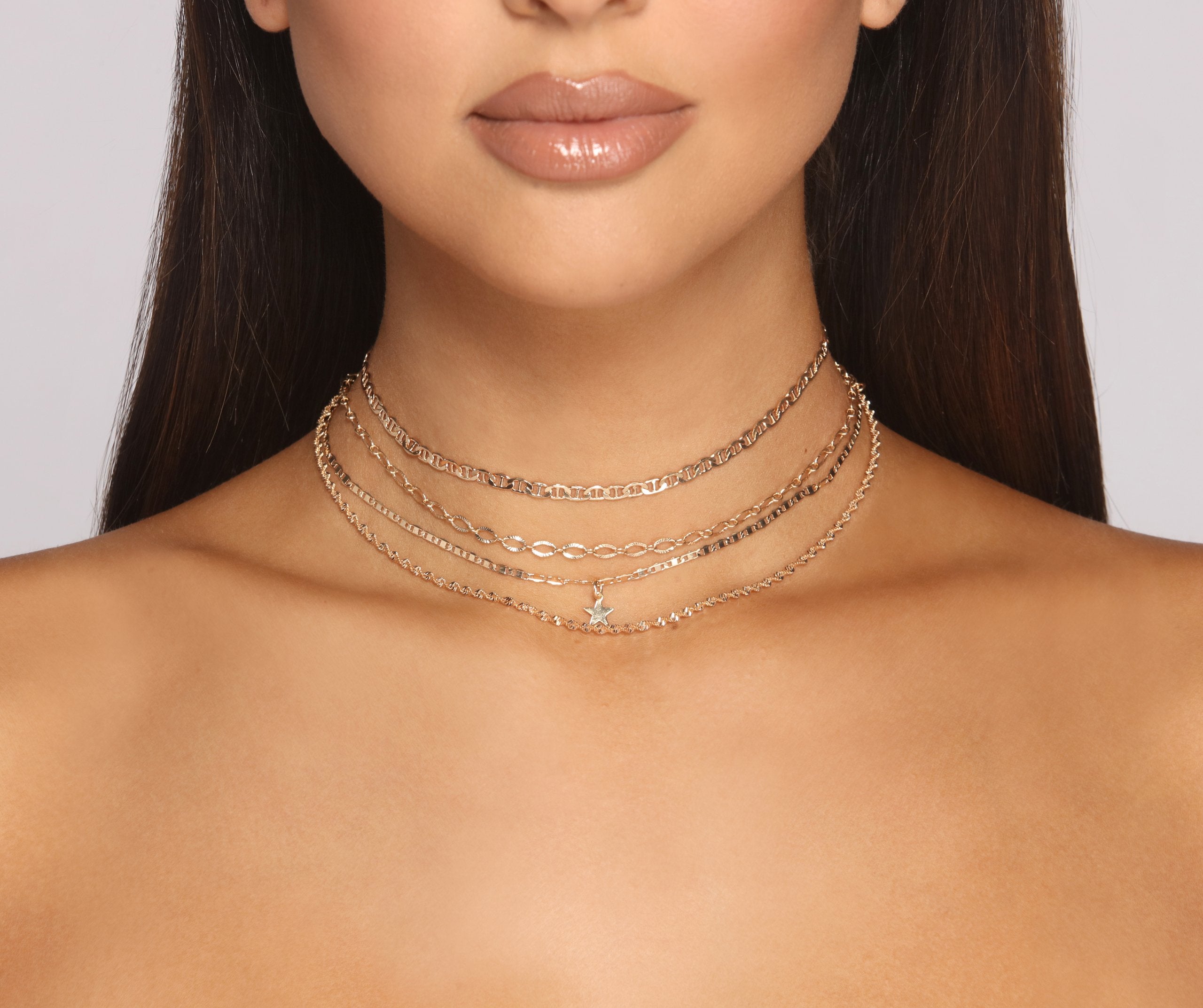 Layer on with chic chokers to add a pop of glam to your casual looks! The multi-pack includes four dainty chain-link chokers. with one featuring a flat star charm. Layer on or wear chokers alone for a stunning look. Complete with a cozy loungewear set and chunky sneakers.