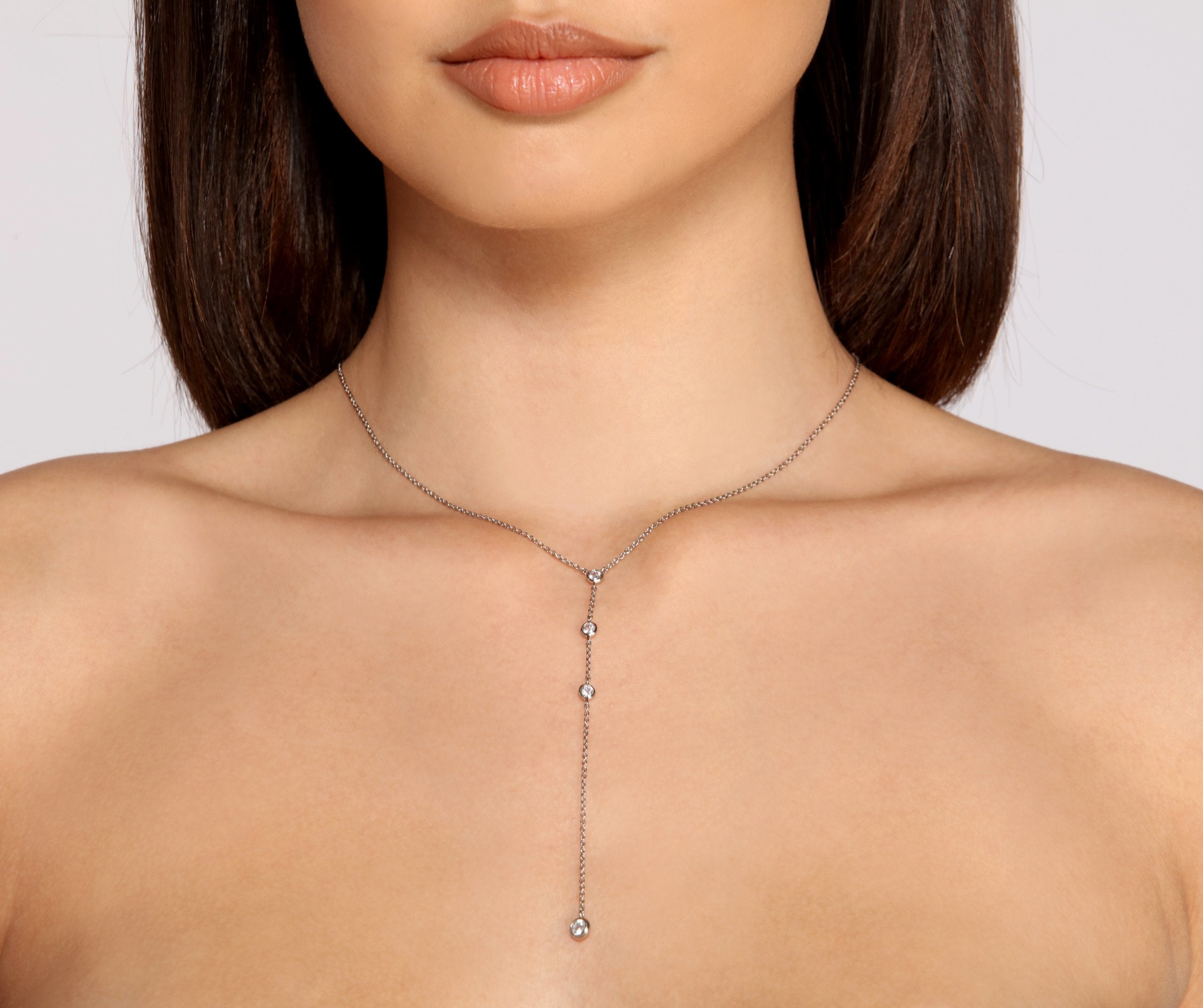Adorn your look with a necklace that brings a luxe detail to your outfit. The necklace features a dainty chain link and a lariat design adorned with four mini rhinestones that sparkle up your look. Complete look with a velvet dress.