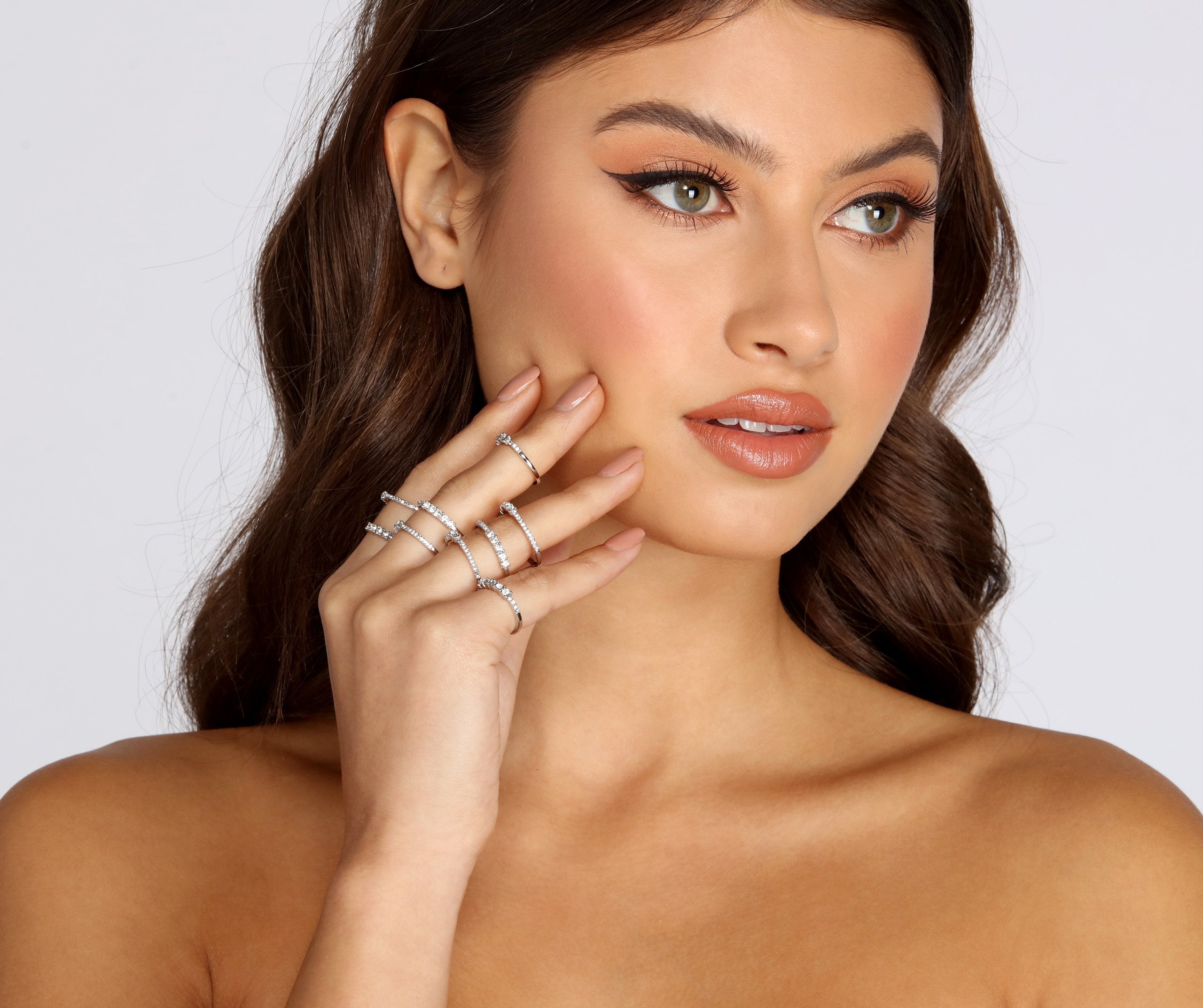 Keep it dainty and chic with a sparkling band to match your mani! This pack includes 5 rings adorned with a rhinestone embellishments. Easily stack or wear alone.