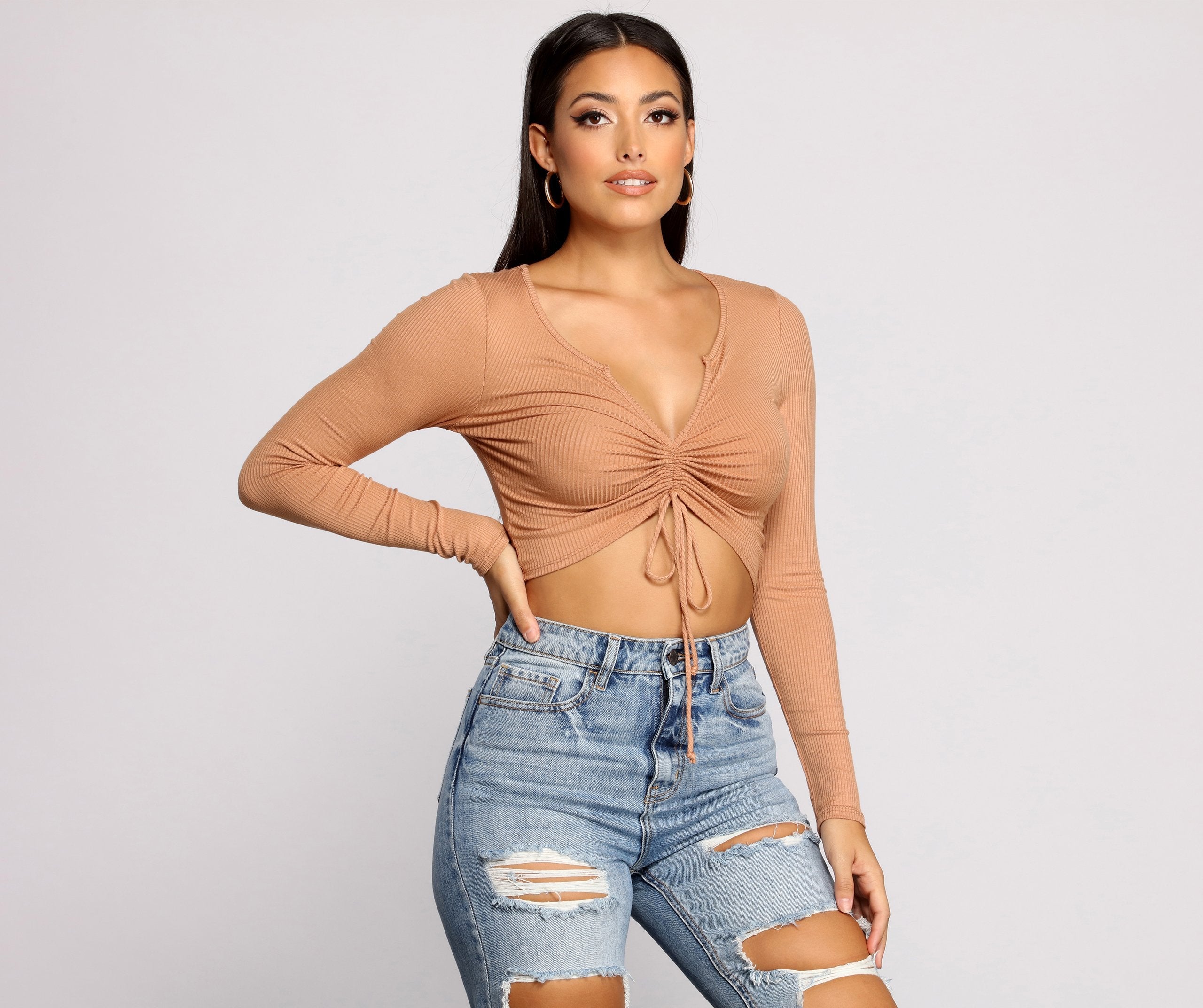 Get drawn in to this cute crop top! The top features a V-neckline with notched detail. a center drawstring. and a cropped hem. The top is composed of a ribbed knit fabric that offers a form hugging fit with a moderate stretch. Complete look with biker shorts.