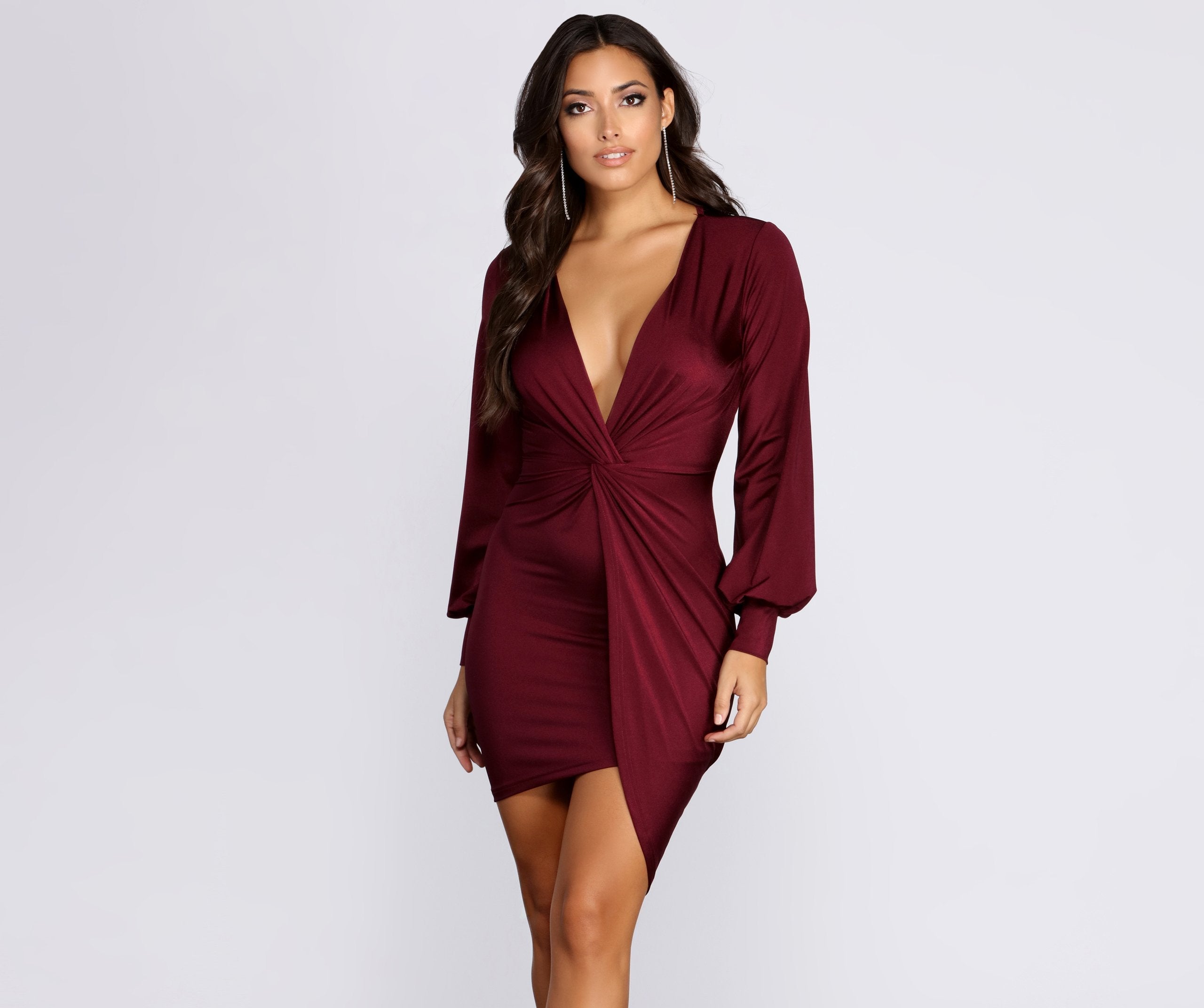 Create a natural attraction with a simply flattering look! This mini dress features a v neckline. long sleeves that puff at the wrist with a thick band. and a front knot detailing at the center of the bodice. Skirt meets bodice with a wrap design and an asymmetrical hemline that meets mid thigh. Dress is composed of a smooth knit material with a sheen reflection and moderate stretch.