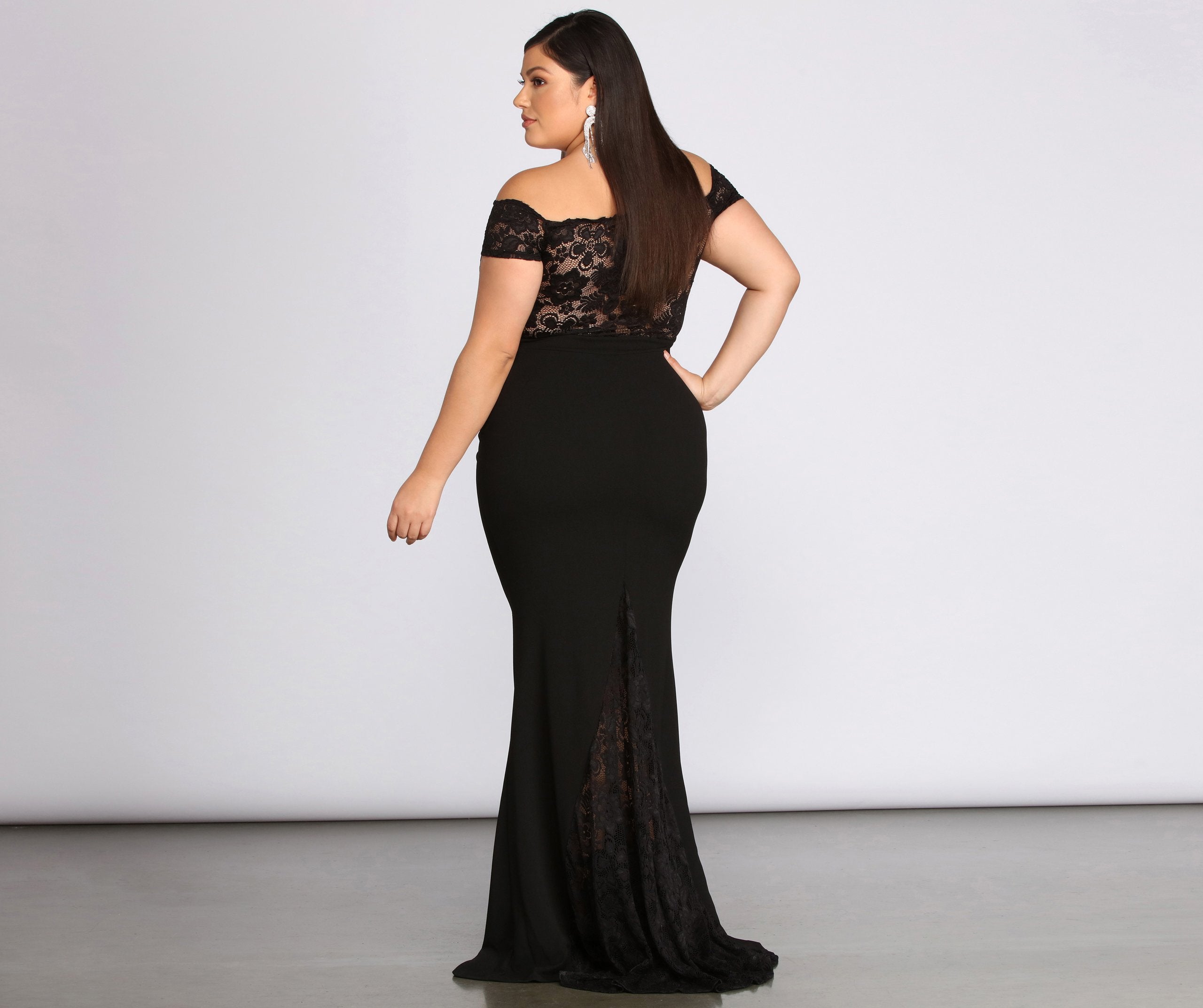 Bring elegance and grace in our head turning Layla dress! She features an off the shoulder neckline. unlined short sleeves and a lined scalloped lace bodice. Her relaxed fit waist leads to an elongating curve flattering floor lengthsilhouette that creates a wowing hourglass illusion. Her silhouette is accented with an unlined scalloped lace train to make a dramatic exit! Dress is composed of a combination lace and crepe fabric that offers a moderate stretch.