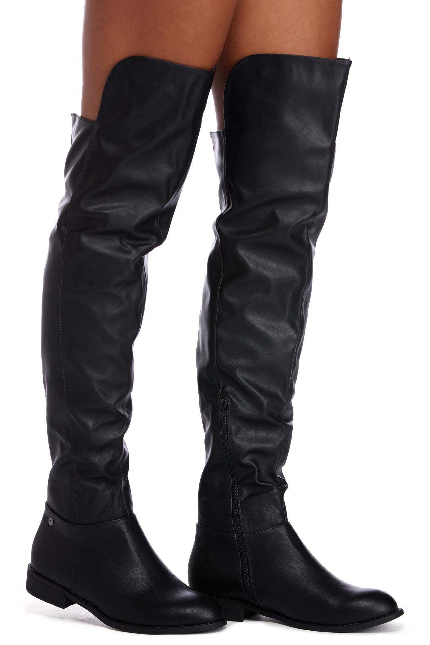 Ride on through to your next adventure in these must have black riding boots! They feature an over the knee fit. an easy slip on design with a partial inner zipper closure and a round toe. The exterior is composed of a black hued faux leather material and the interior is lined with a lightly cushioned knit material.