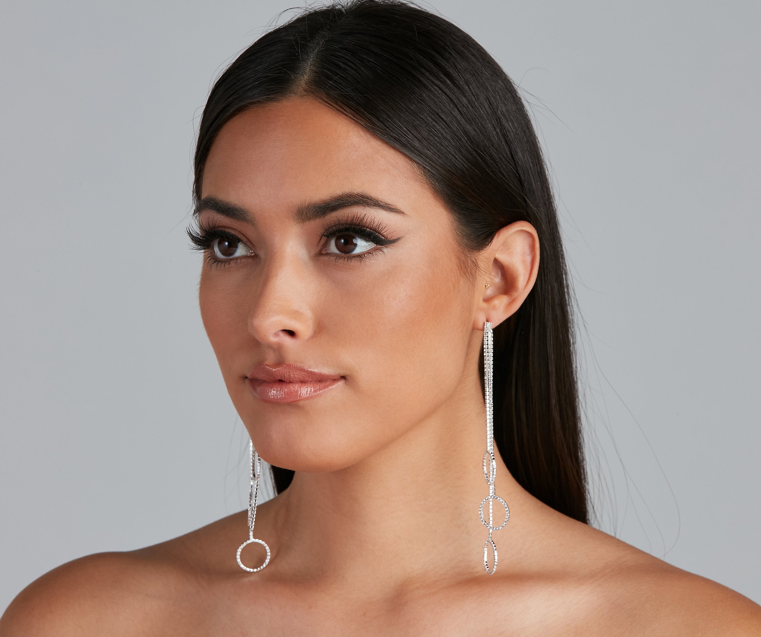 You'll be running in circles for these rhinestone earrings! They feature o-ring charms. fringe. and a post-back closure. Complete the look with a sparkly bracelet.