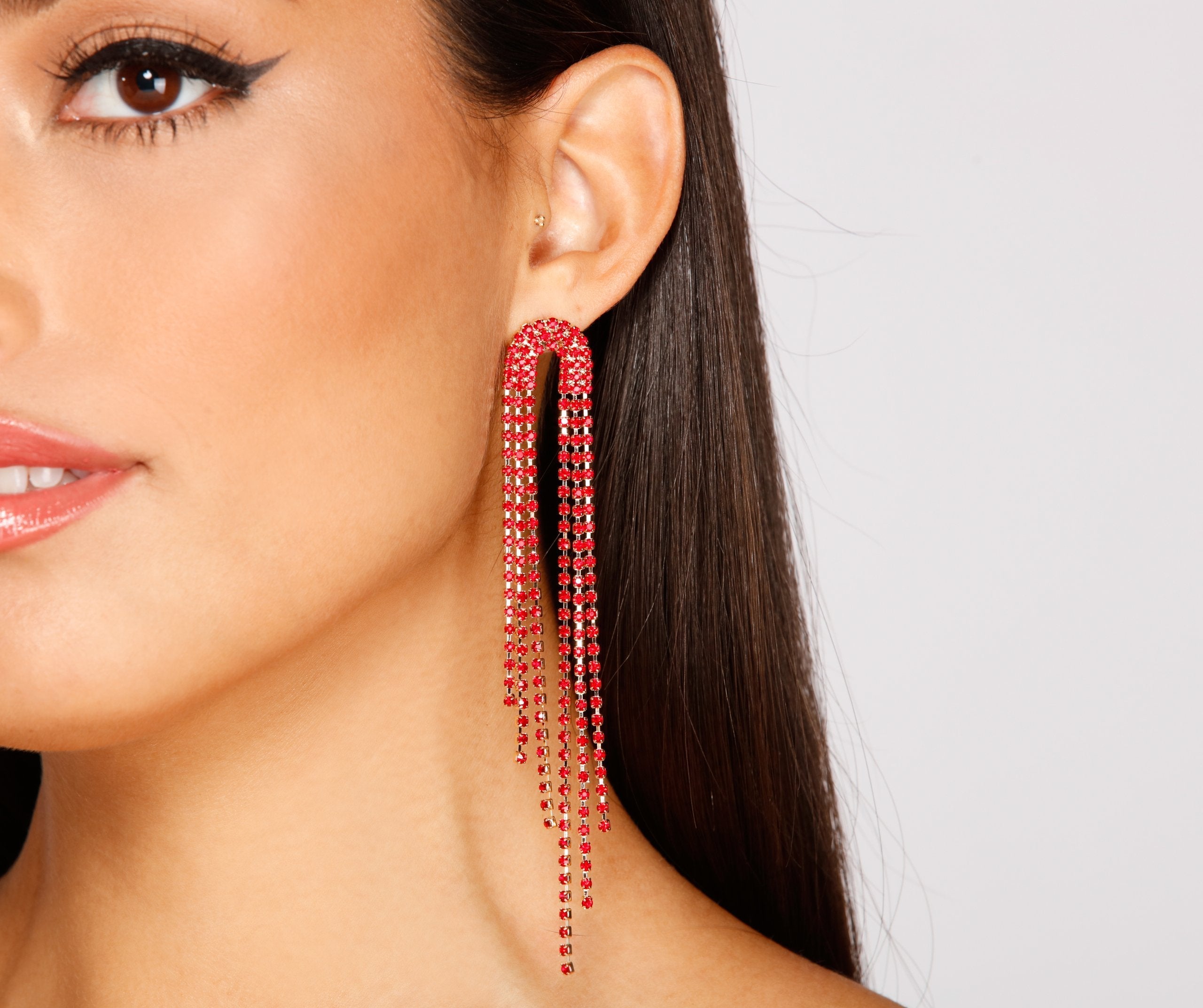 Keep it so haute with glam earrings that elevate your look! The earrings feature a U-shaped design on post and a cascading rhinestone fringe. Complete look with a formal velvet dress and rhinestone heels.